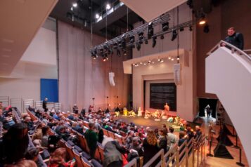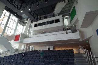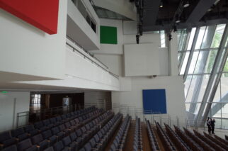 The Auditorium serves as a multipurpose performing space. It is equipped with movable seating rows to adjust the seating rake and capacity, as well as deployable acoustical banners and black-out curtains. Since the project also required that the space be suitable for live classical music performances without the use of any electronic sound enhancements, the acoustical design focused primarily on the room shape and the choice and placement of interior materials. The abundance of glazed surfaces posed one of the main challenges to the acoustical design of the space. Smooth and flat glass surfaces were limited to the upper portion of the space, while curved glass panels were introduced in the lower portions to diffuse direct sound reflections. Massive movable sound reflectors, made of thick cast aluminum, project the sound from the stage and improve acoustical communication on stage. The walls and ceiling alternate reflective and absorptive panels behind an acoustically transparent grid unifying the visual aspect of surfacing and creating sound diffusion.􀀃