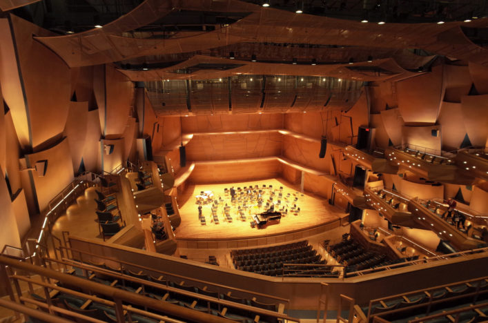 With its large stage, fly tower, concert hall-quality sound reflection panel system, an orchestra pit that can accommodate 70 musicians and a proscenium-style stage, this hall fulfills the design intent of a multipurpose theatre that can adapt to the performance needs of many genres. Formally known as Julianne Argyros Orchestra Hall, the hall has a hexagonally-shaped footprint, with main floor audience seating, 2 tiers of balconies at the rear of the hall and 16 loge boxes at the sides of the stage. The proscenium opening measures 19x11m (62x36ft). A shell system was designed to provide appropriate acoustic reflections for classical music performances and to visually contribute to the feeling of continuity between audience and stage. When combined with the hall’s steel frame and equipment for lighting, these elements have a total weight of 55,000kg (120,000lbs).