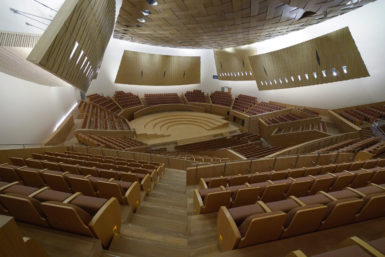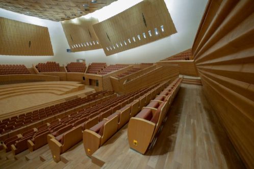 At the beginning of the architect’s work on the project, the client, the architect and Nagata Acoustics discussed the basic hall configuration options and agreed that the best configuration for this hall is the so-called vineyard shape, with seating on all sides of the stage and much of the seating divided into terraced blocks of seating. The ceiling and the panels that protrude along the side walls are constructed of a wood product with a mesh-patterned finish that creates the acoustically needed sound diffusion that we desired for this hall. In the design, the twin goals of rich acoustics and clarity of sound were prioritized. These two acoustical goals are often considered to be in conflict with each other. Nevertheless, in this hall, both of these goals were achieved with the finest quality for each.