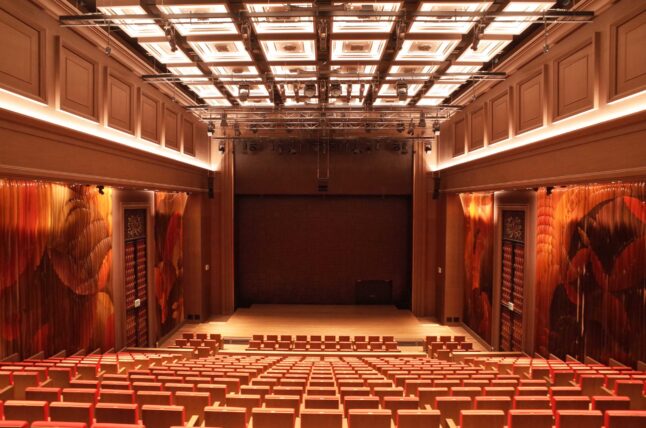 Two different stage configurations are programmed depending on the necessary depth needed for the musicians. A system of mechanical audience seats can transform the space from a raked auditorium for 470 seats in the narrow stage condition into an empty flat floored event space, with or without seats.