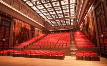 In order to prevent any acoustical issues caused by the overall parallel walls, large convex bumps were introduced to form the acoustical envelope. To hide these GFRG panels, the side walls of the auditorium feature a striking installation of aluminum fins designed by D’Art: the Specialist Art Company. The fins create a colorful surface with floral relief while preserving acoustical transparency.